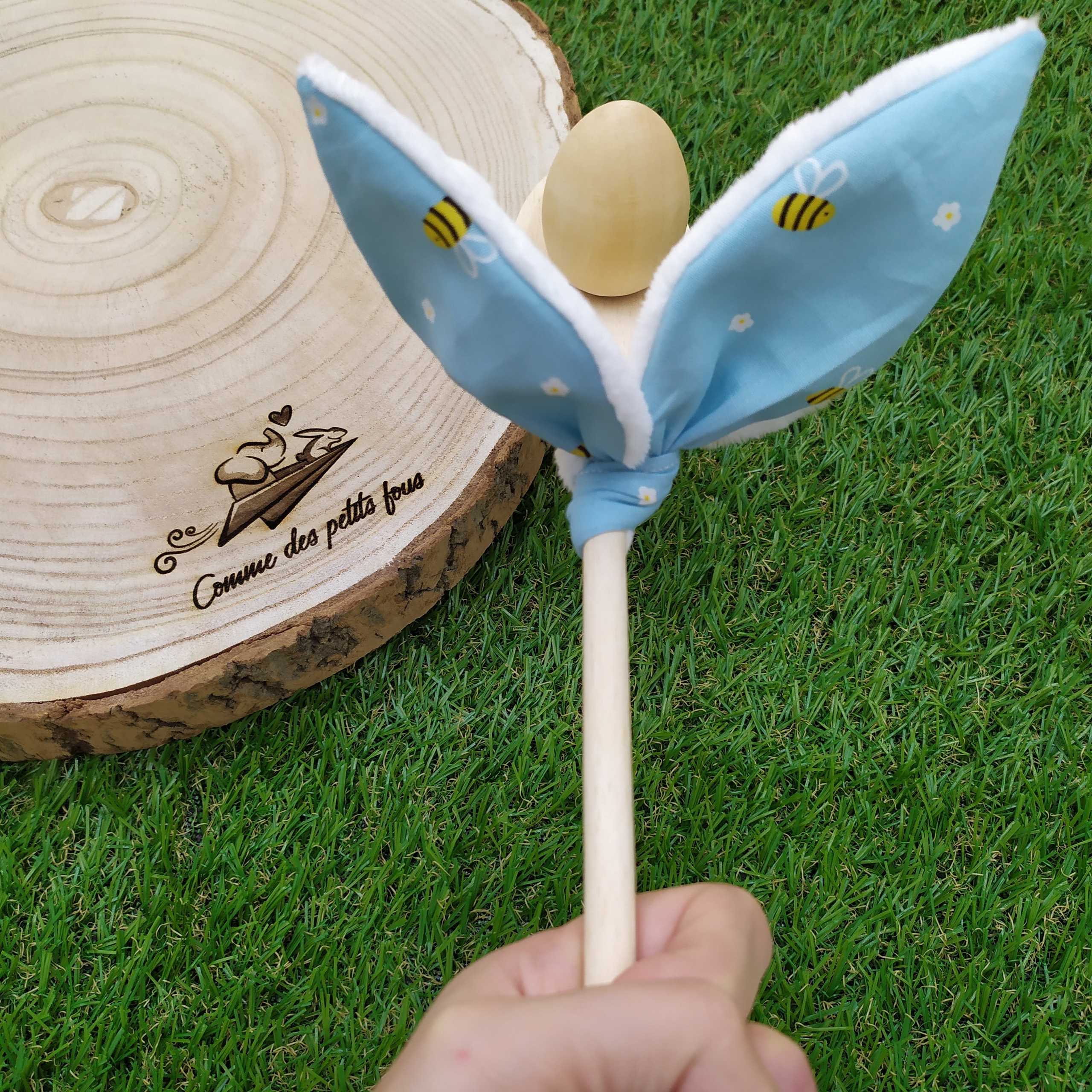 Le petit + comme des petits fous : La difficulté augmente en tenant la cuillère au bout d'un manche, pour les plus petits, on peut attraper la cuillère à 2 mains et les situer juste derrière les petites oreilles du lapin.